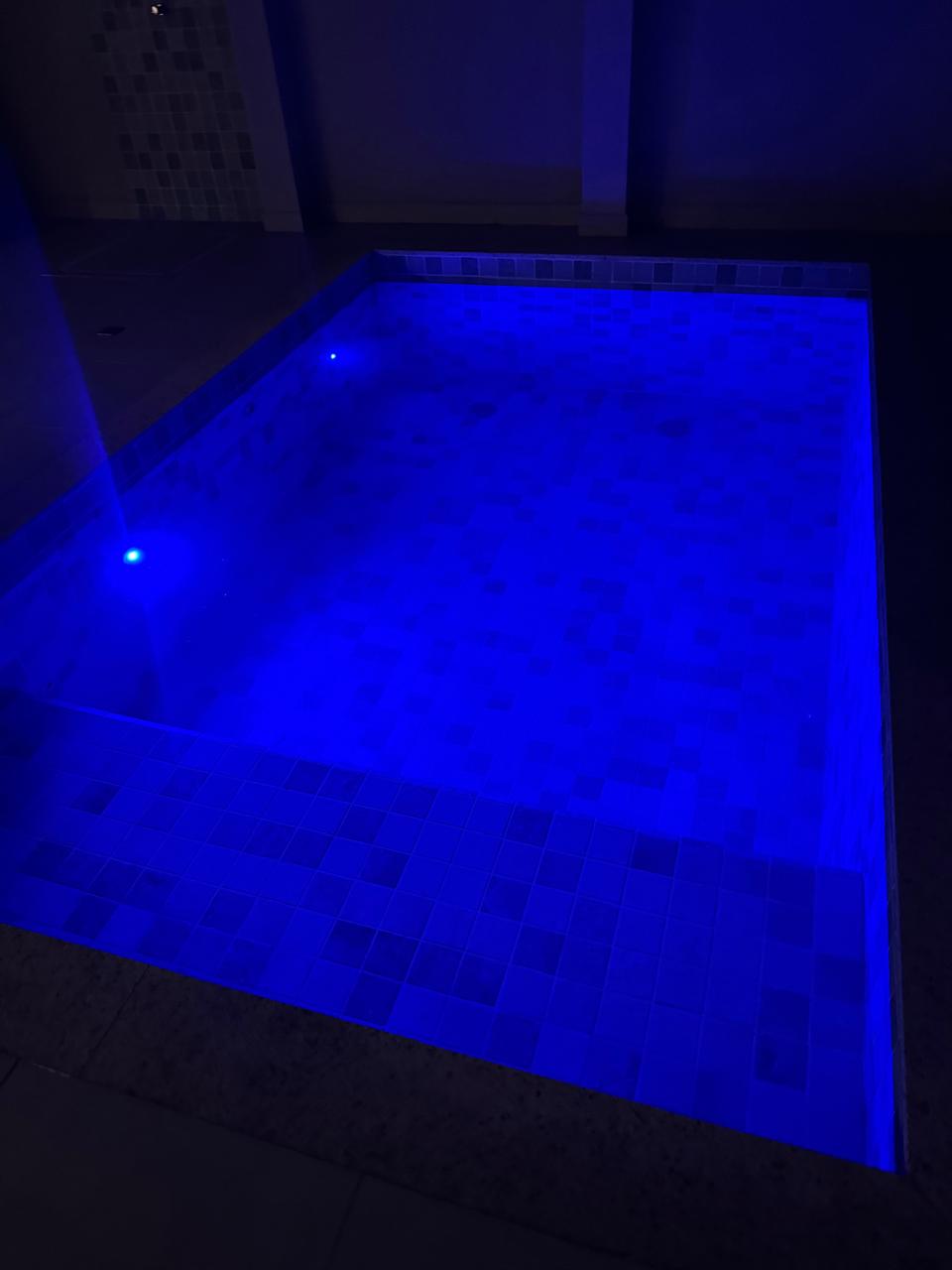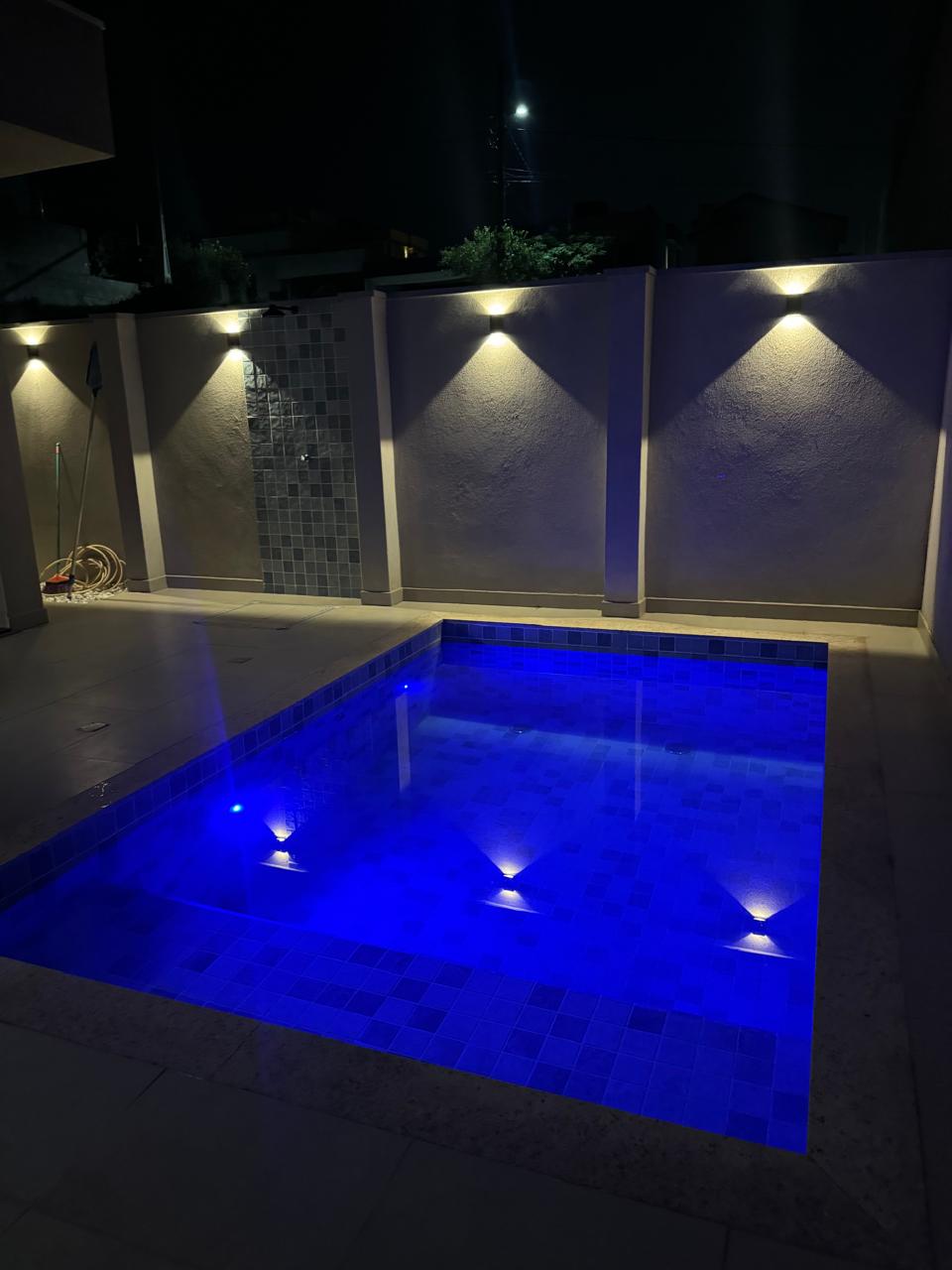 - área gourmet com churrasqueira planejada, piscina e mesa externa;