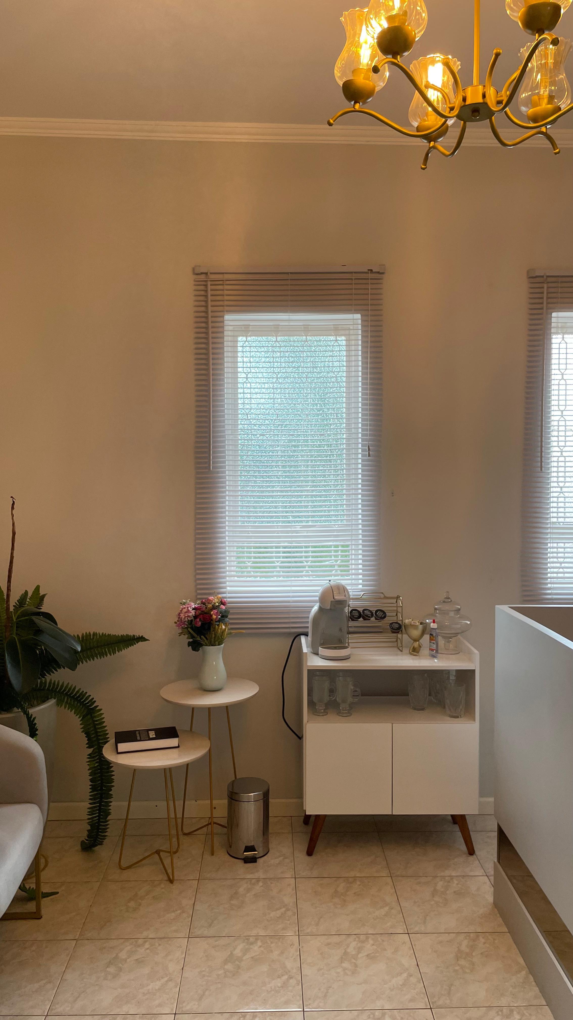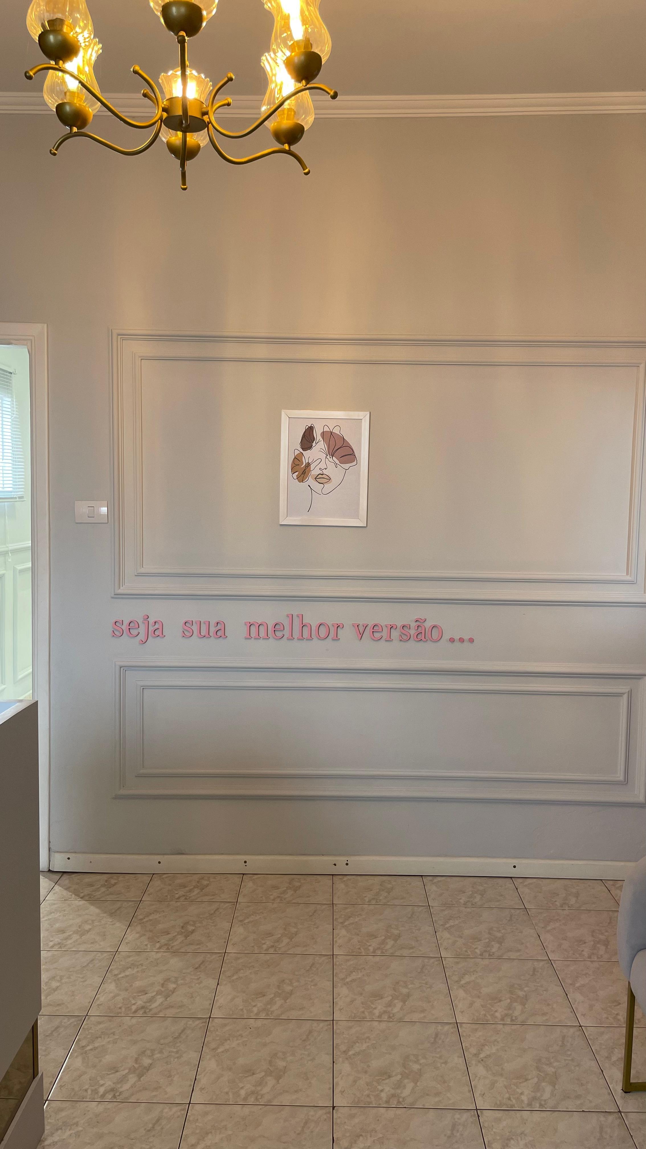 - Arandelas douradas, boiserie, prateleiras com plantas e frase motivacional “Acredite em você!”.