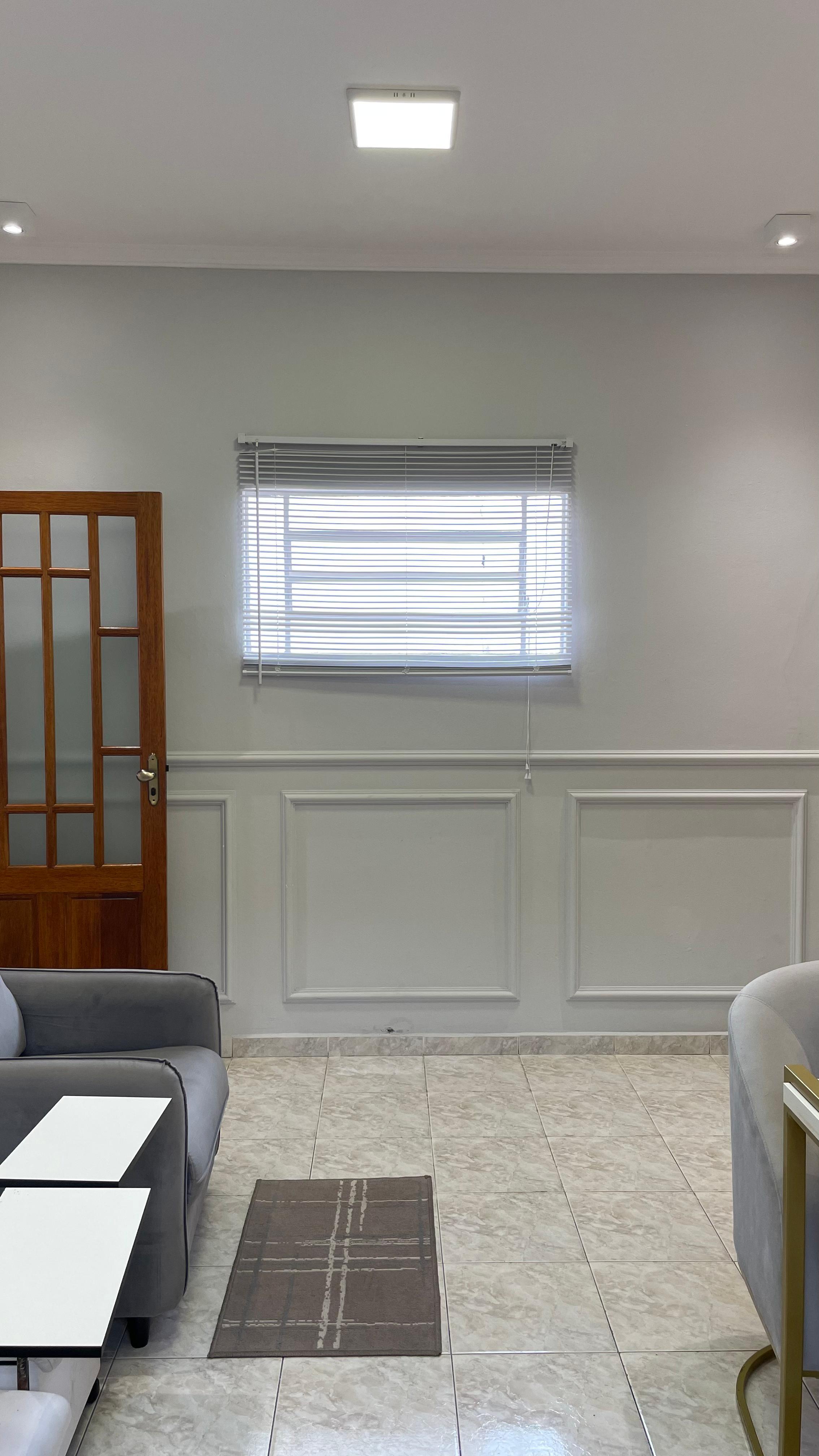 - Iluminação branca uniforme (4000K) com luminárias e spots estrategicamente posicionados.