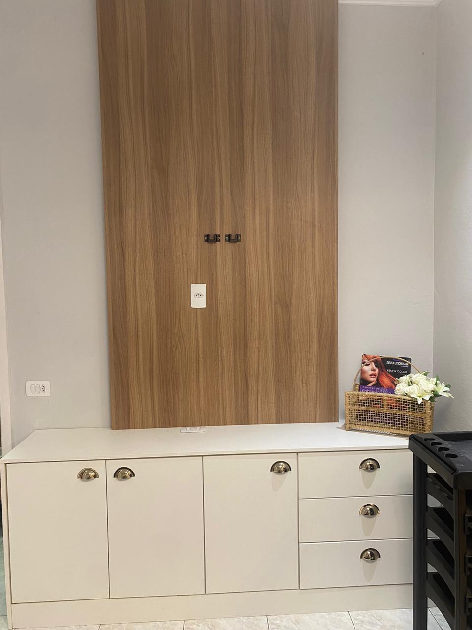 - Carrinho auxiliar, cadeiras adicionais, balcão com gavetas e painel em MDF.