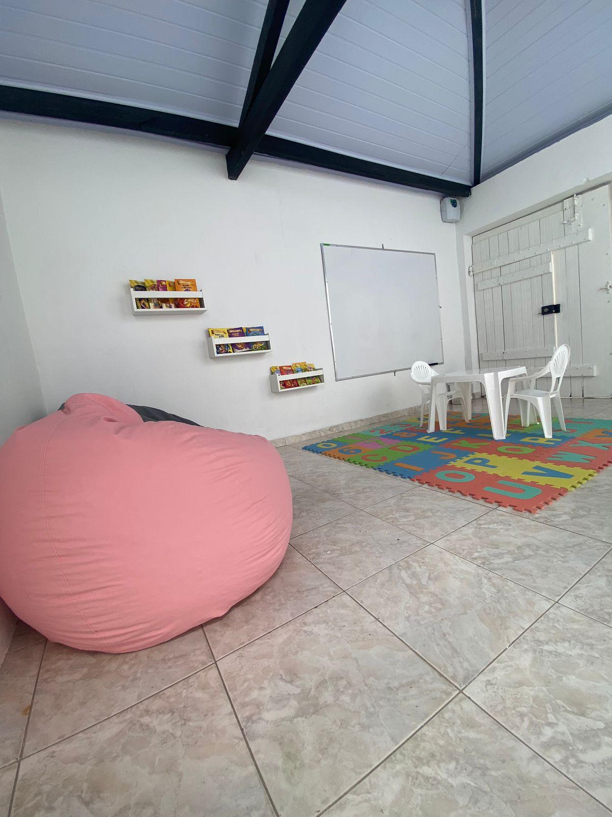 - Área kids com mesa e cadeiras infantis, prateleiras com livros, quadro branco e puffs.