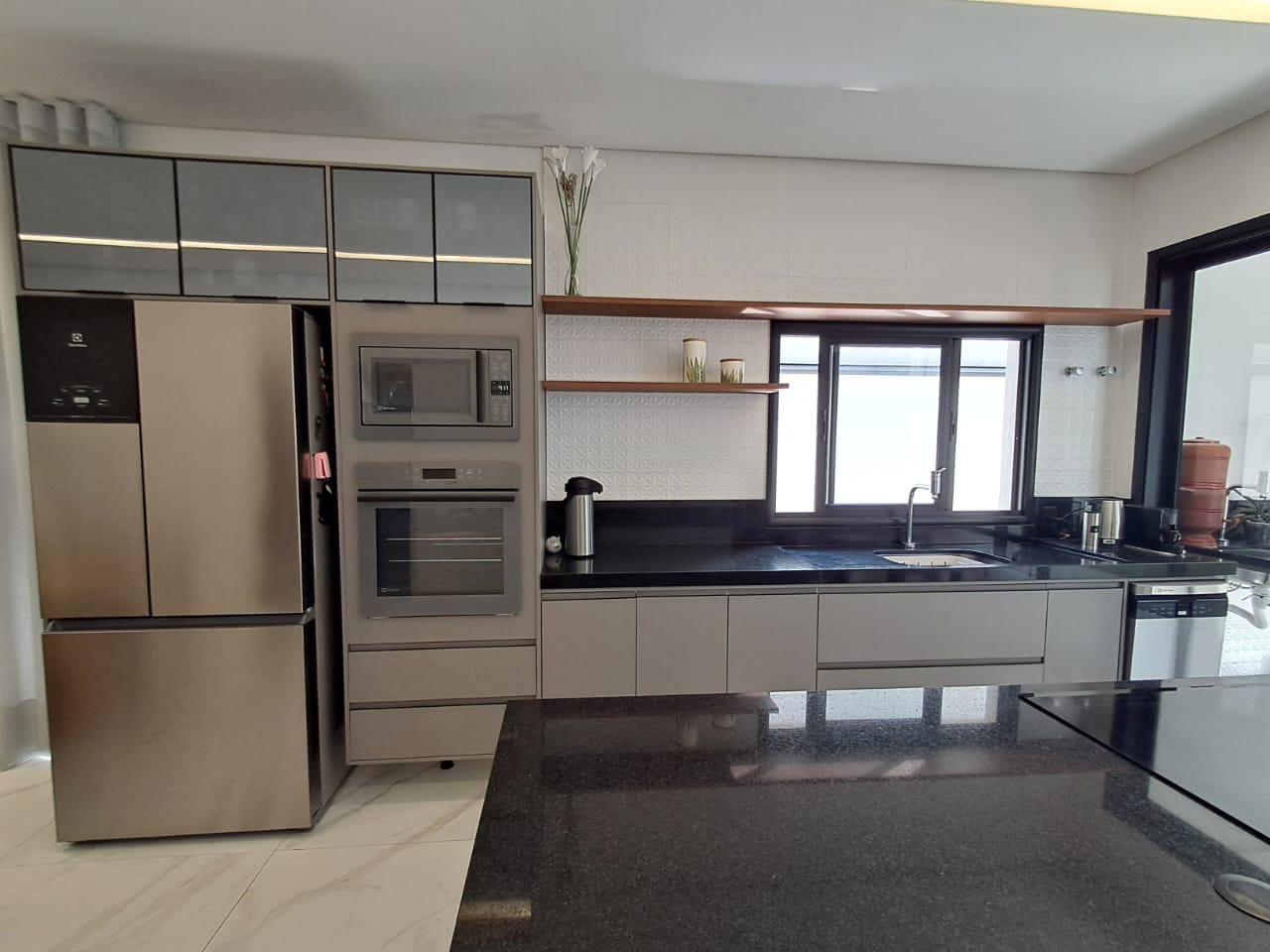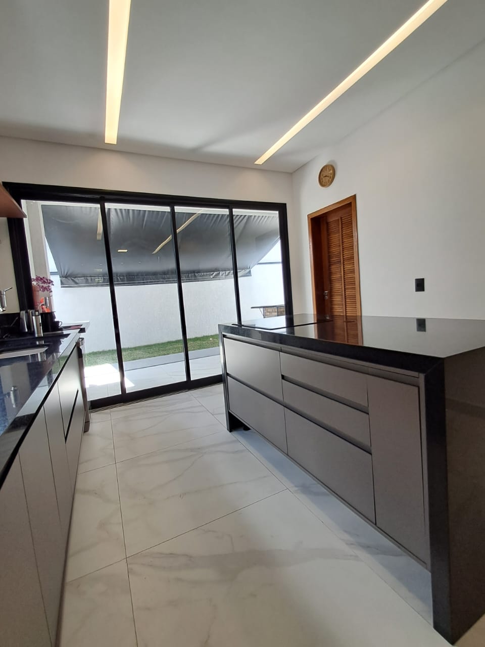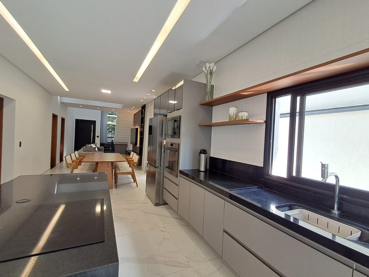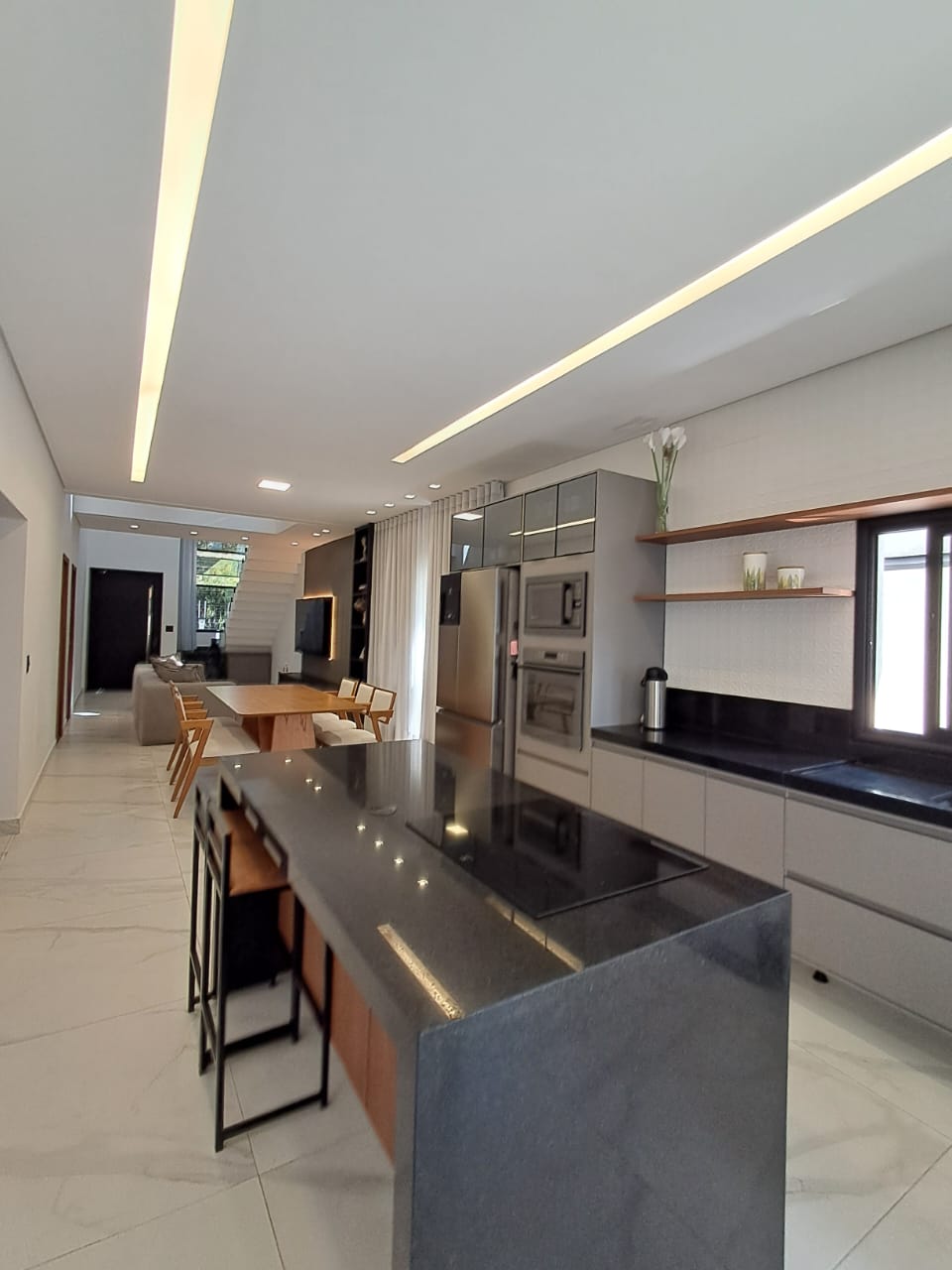 - Cozinha conceito aberto, com ilha em pedra e fogão cooktop de indução;