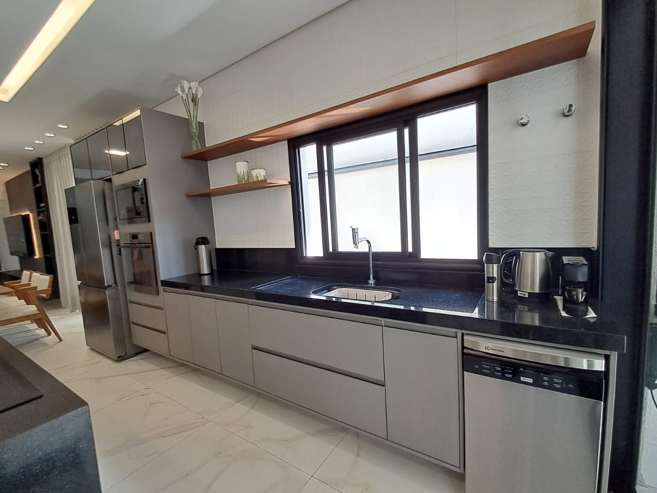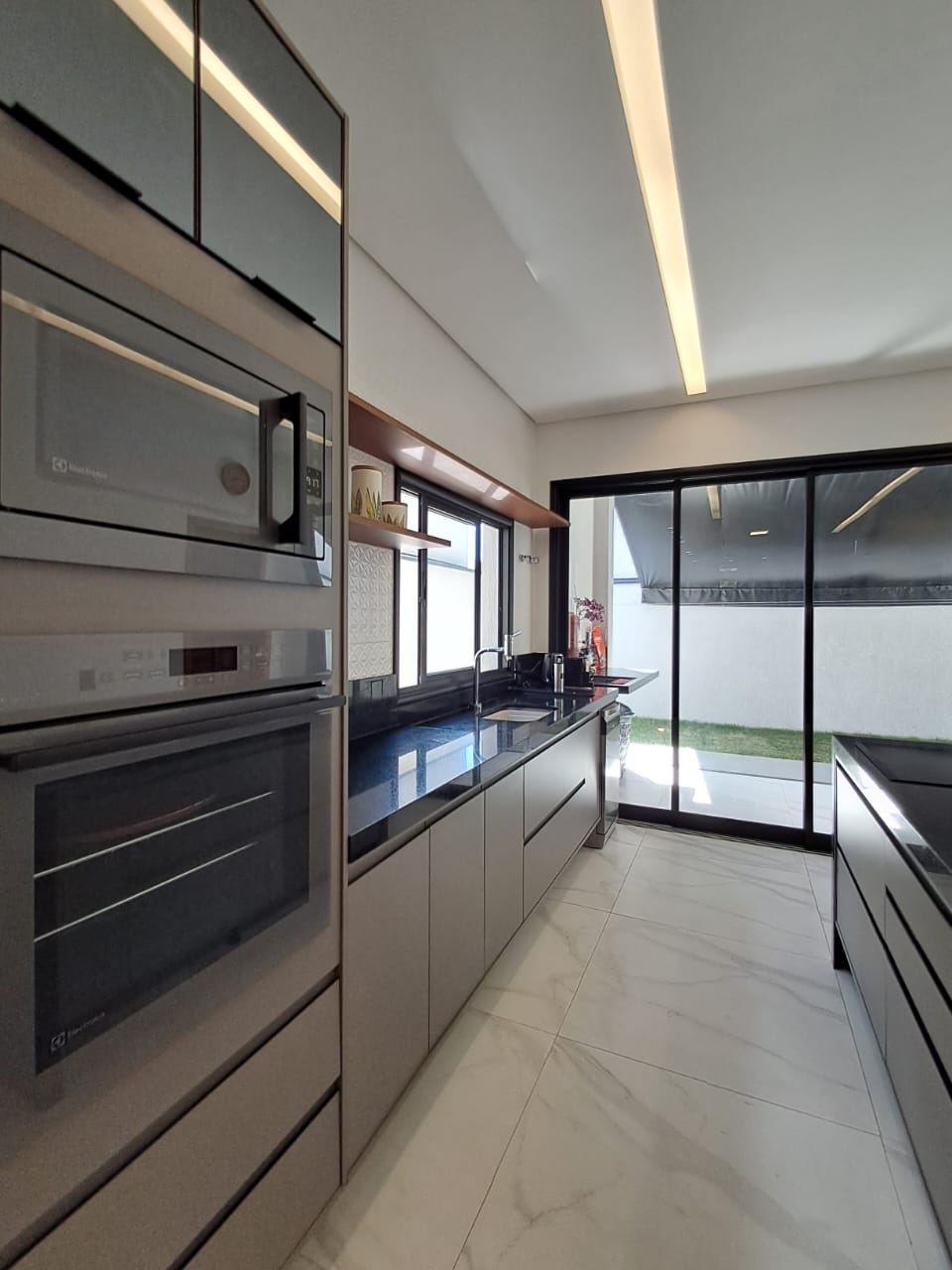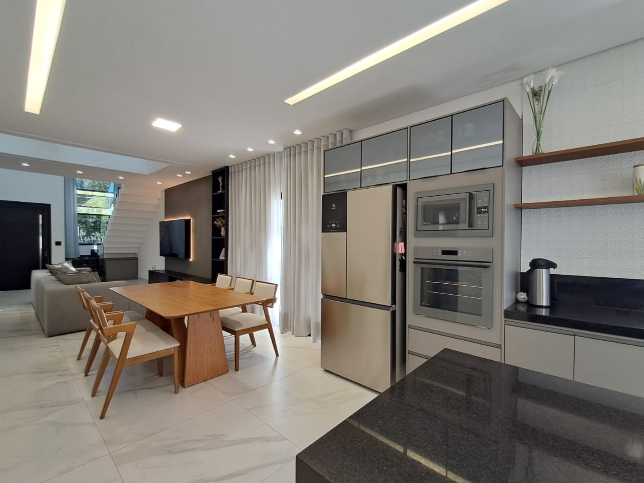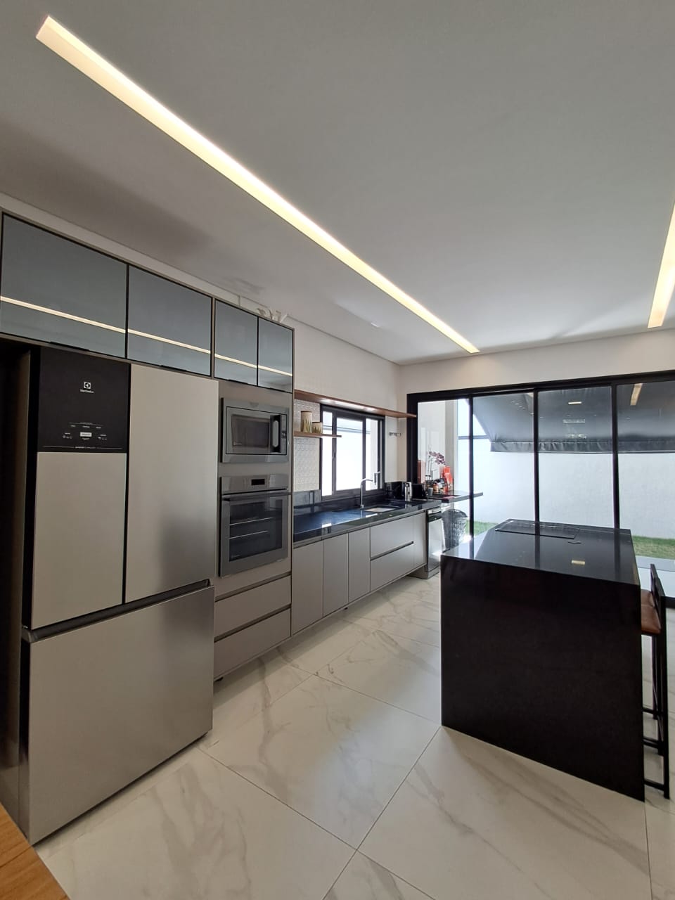 - Cozinha conceito aberto, com ilha em pedra e fogão cooktop de indução;