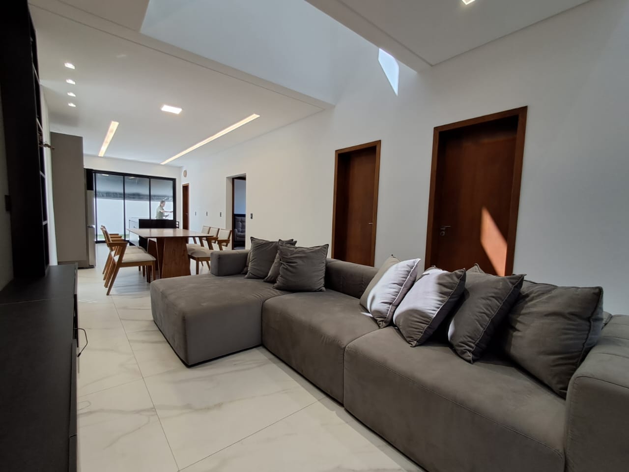 - Sofá da sala comprado para o desenho dos móveis planejados, combinando com cor e estilo da sala planejada.
